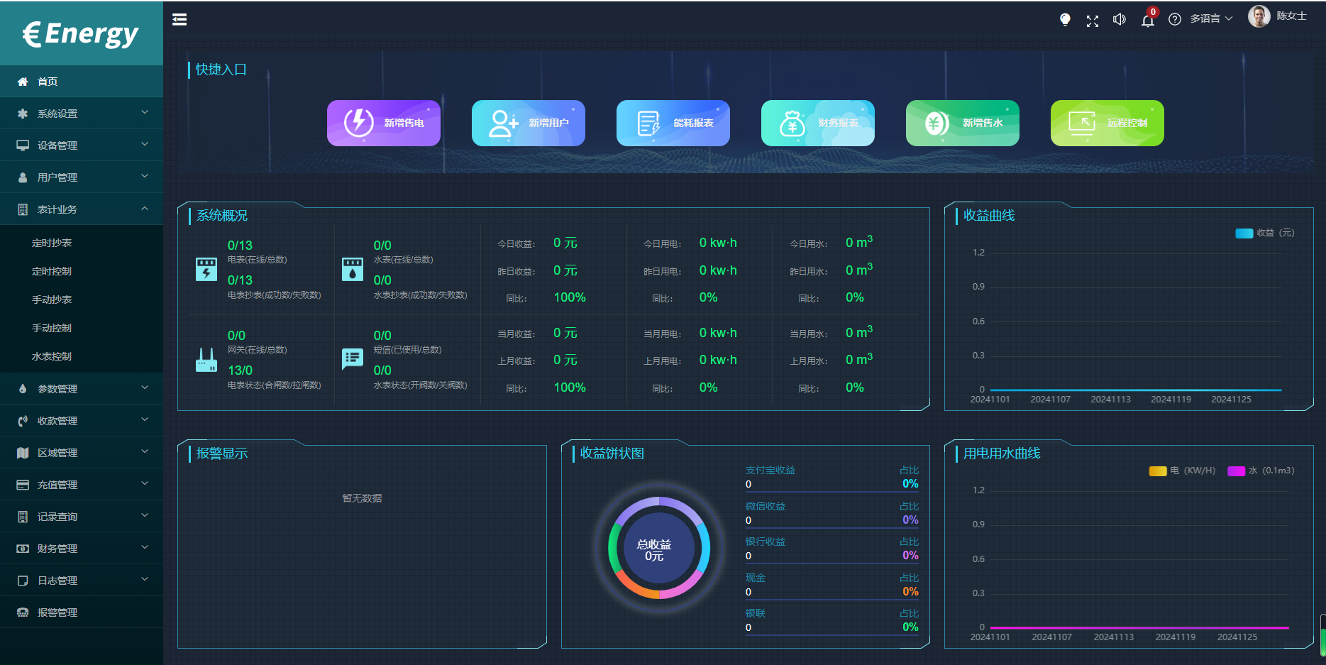 自动抄表:系统自动记录每个时间段内的用水、用电数据,避免了人工抄表的繁琐性和不准确性,费用计算:根据不同用户的合同条款和用量,自动计算出各个用户应交的水电费账单生成和推送:系统根据计算结果自动产生费用账单,并通过电子邮件、短信或移动应用等方式推送给用户。线上支付:用户可以直接在系统提供的平台上通过网银、支付宝、微信等支付工具支付水电费,简化了缴费流程,数据统计与报表:系统提供实时数据监控和历史数据分析,生成各类统计报表。