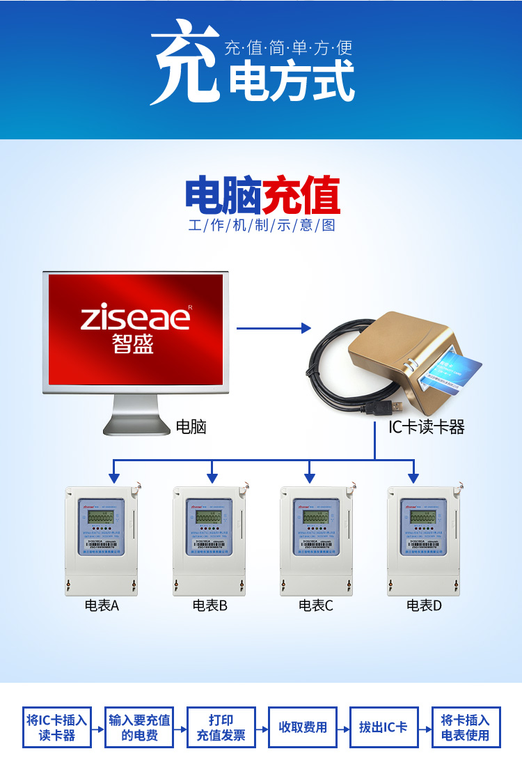 (二)充电方式:三相预付费电度表(公用表)的充值系统安装到电脑上,读卡器连接电脑的USB进口,就可以实现对电表IC的充值,充值成功后用户就可以插电表使用了,可实现一表多卡和多表多卡的功能。(具体操作的书面教程和视频教程可进入官网查看)
