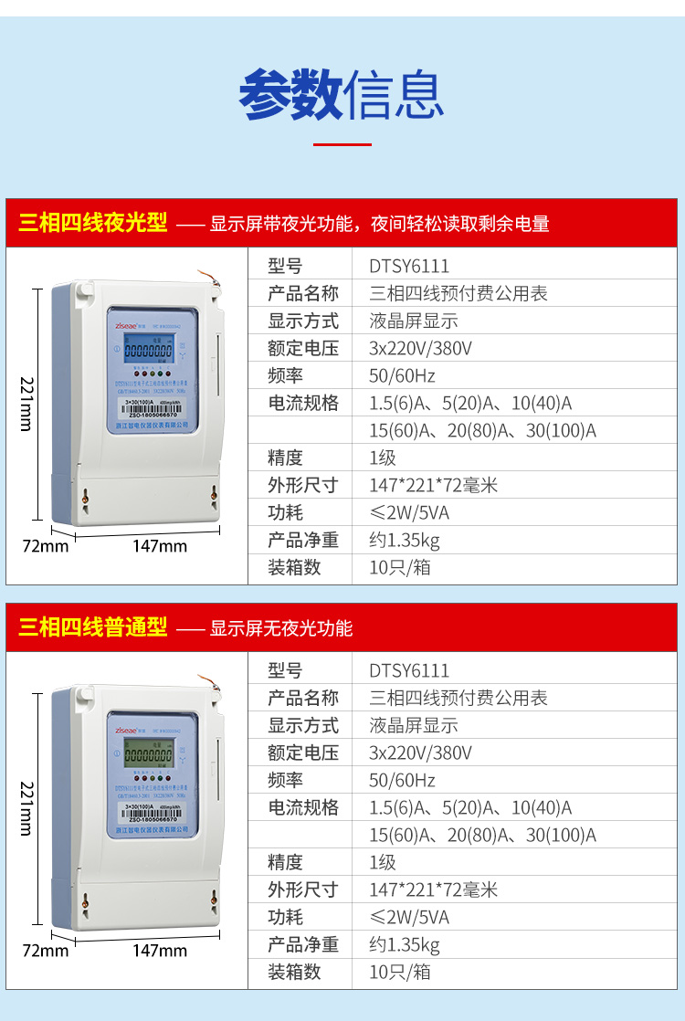 (四)三相预付费电度表(公用表)的参数信息:产品名称、显示方式、额定电流、频率、电流规格、精度、外形尺寸、功耗、产品重量,装箱数等信息,具体如下