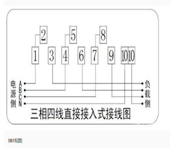 三相预付费电表直接式的接线比较简单,编号从1到10,有的朋友只看到底部的7个接线柱,其实还有2、5、8三个接线柱,只不过这三个接线柱和147用连接片短接了,所以不需要再接线。这种直接式的三相四线电表的接线顺序是:147接三相电源的进线,369接出线,最后的10接进出的零线。