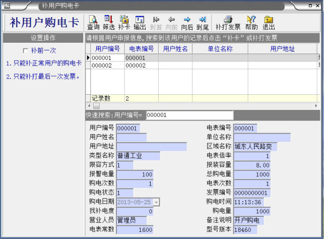 本章节通过图片和文字,详细的介绍预付费电表在售电系统补卡的步骤: