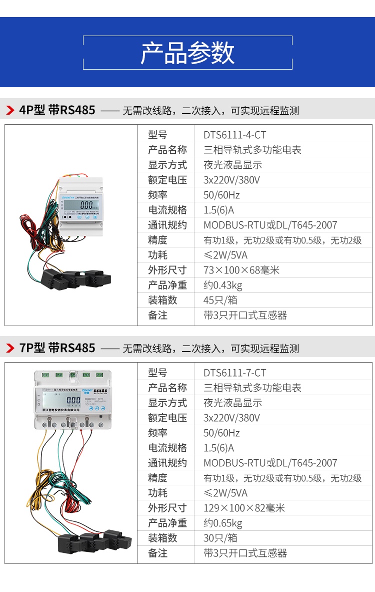 5.通讯功能:具有RS485通讯功能,可用连接RS485通讯网络进行远程抄表和集中管理,标准配置通讯协议支持DL/T645-2007或Modbus-RTU协议
