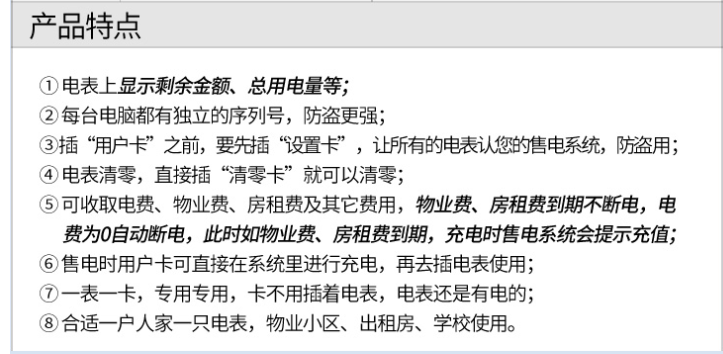 主要特点:应用计算机管理,先购电后用电;在额定电流范围内能限制使用功率(由供电部门限定);一表一卡,专卡专用,失卡不失电,补卡再用;电卡能双向传递数据,能自动断电告警用户购电;电量为零时,自动拉闸断电;并具有一定的防窃电软件设计等。
