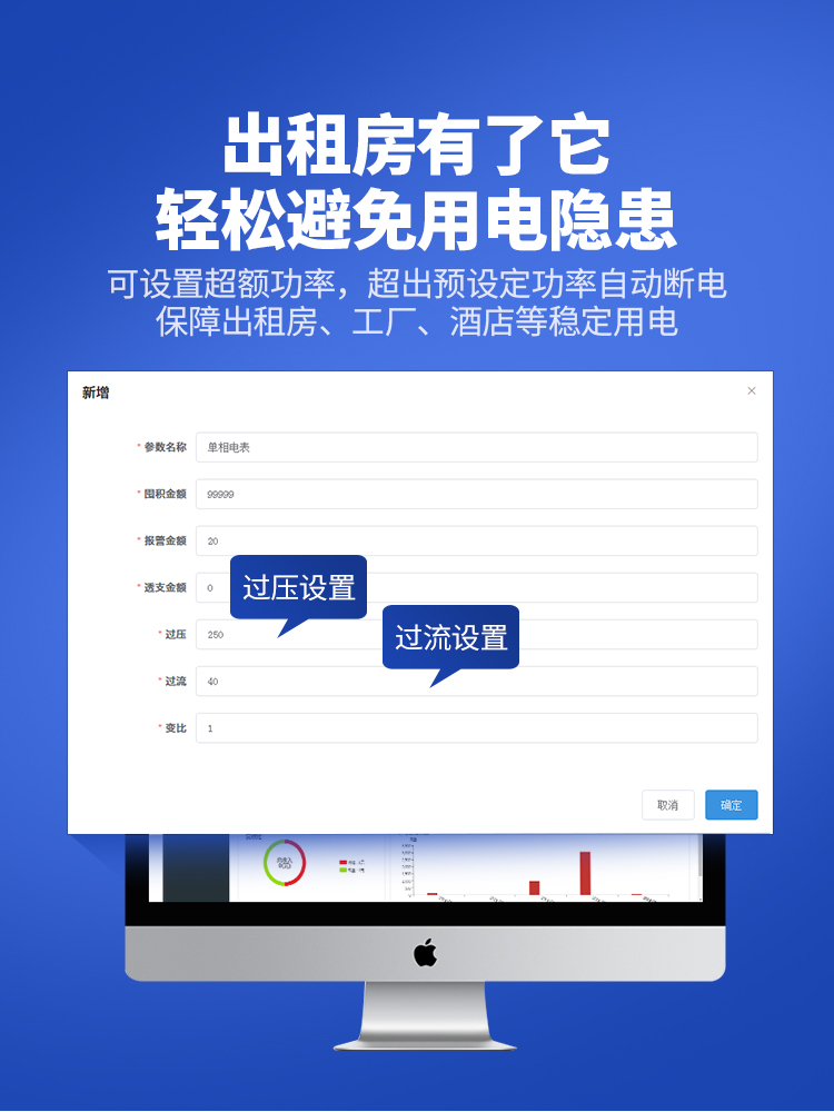 远程充值预付费电表可与本公司远程抄表系统和手机APP配套使用,远程抄表管理系统具有实时抄表、定时抄表外,还提供了设备管理功能,如告警、余额短信通知、远程充值、手机抄表、手机查询、手机充值、预付费、后付费、自助充值机充值、远程拉合闸、过压过流保护、各种查询报表、统计报表下载等功能。