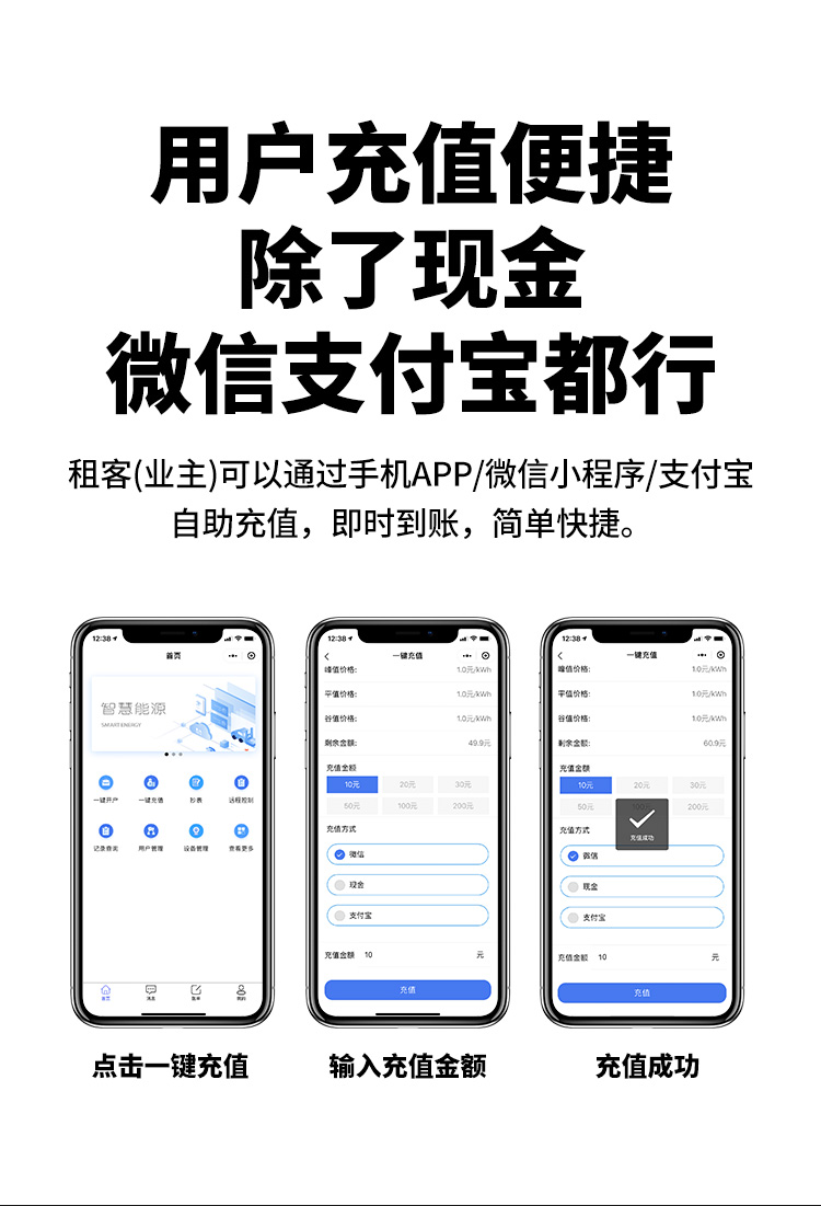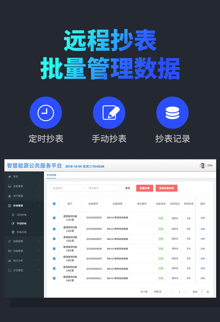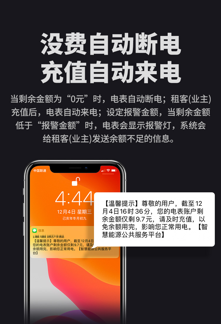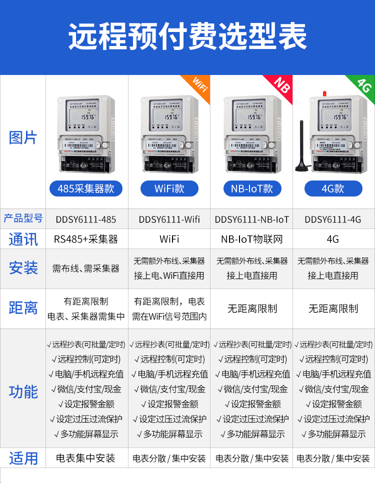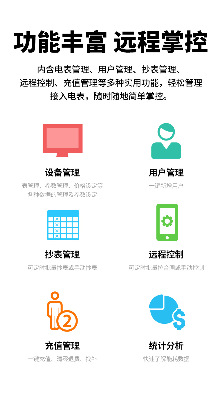 本公司DDSY6111\DDZY6111远程智能电表与本公司远程抄表系统和手机APP配套使用,远程抄表管理系统具有实时抄表、定时抄表外,还提供了设备管理功能,如告警、余额短信通知、远程充值、手机抄表、手机查询、手机充值、预付费、后付费、自助充值机充值、远程拉合闸、各种查询报表、统计报表下载等功能。
